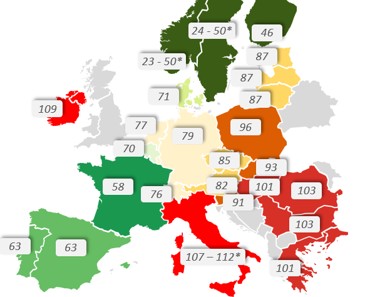 Abb. 2: Börsenstrompreise nach Gebotszonen, 2024 in EUR/MWh (Italien, Schweden und Norwegen haben mehr als eine Gebotszone, weshalb es über das jeweilige Land unterschiedliche Börsenstrompreise gibt); Quelle: ENTSO-E, Frauenhofe ise, Energy-Charts, Stand: 8. September 2025