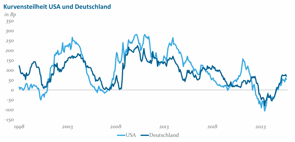 Seit der Finanzmarktkrise haben sich die beiden Renditestrukturkurven abgeflacht. Seit der Jahresmitte 2023 nimmt die Steilheit wieder deutlich zu.