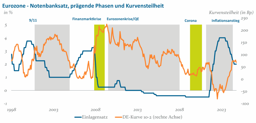 Abb. 2: Eurozone – Notenbanksatz, prägende Phasen und Kurvensteilheit; Quelle: EZB, Bloomberg, Helaba Invest