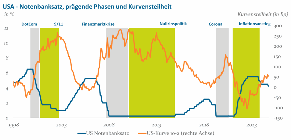 Abb. 3: USA – Notenbanksatz, prägende Phasen und Kurvensteilheit; Quelle: Fed, Bloomberg, Helaba Invest
