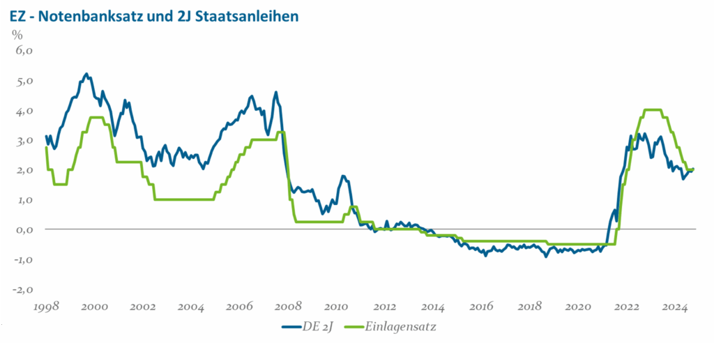 Abb. 4: EZ- Notenbanksatz und 2J Staatsanleihen; Quelle: EZB, Bloomberg