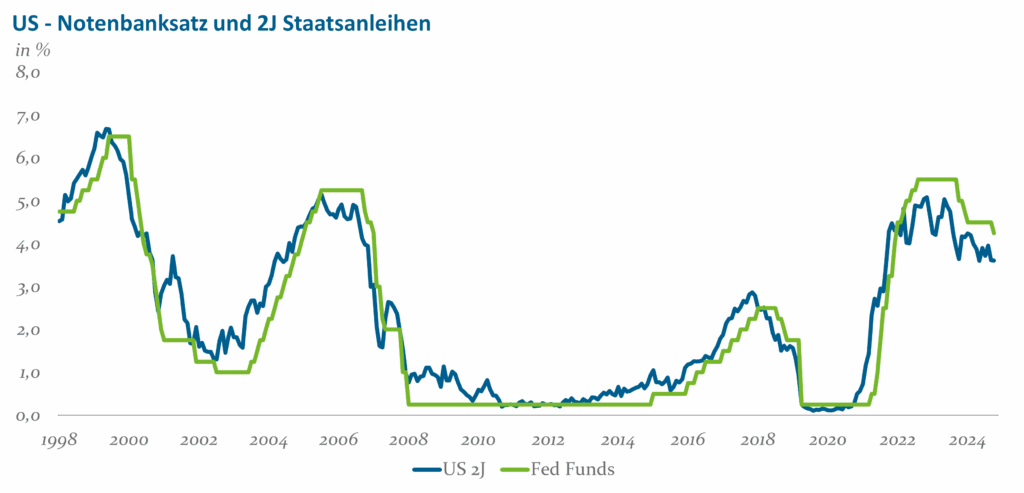 Kurzlaufende Staatsanleihen stehen im Spanungsfeld zwischen Notenbankpolitik, Inflationserwartungen und fiskalischen Bedürfnissen. Bleiben die Notenbanksätze und die Inflationserwartungen länger unverändert, dann wird sich die Entwicklung der 2-jährigen Anleihen dem Notenbanksatz annähern. Somit hat die Notenbankpolitik auch eine Wirkung auf das „kurze Ende“ der Renditestrukturkurve.