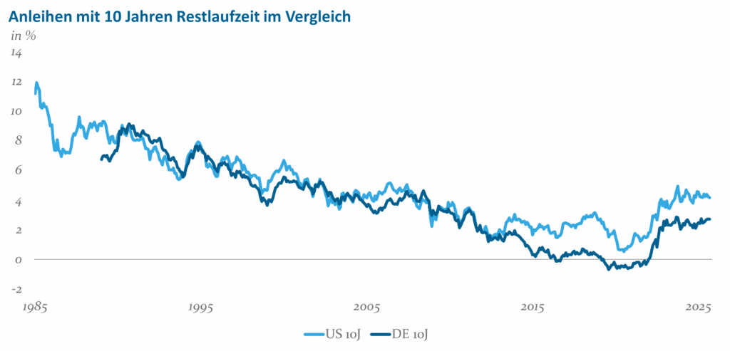 Gerade für Europa wird keine größere Veränderung in der Inflationsentwicklung erwartet. Das findet sich auch bei Umfragen zur EZB-Notenbankpolitik wieder. In diesen wird erwartet, dass die EZB in den nächsten zwei Jahren in der Nähe des aktuellen Einlagensatzes von 2% verharren wird. Somit scheint das kurze Ende der Renditestrukturkurve in den nächsten Quartalen kaum Variabilität aufzuweisen. In den USA stehen vermutlich noch Zinssenkungen an, die die Fed Funds auf 3,5% sinken lassen könnten. Das nehmen die 2-jährigen US-Treasuries heute schon vorweg.