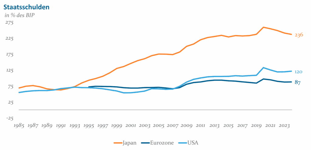 Trotz wiederholter Sparmaßnahmen steigt die Neuverschuldung weiterhin an, da die Ausgaben konstant höher bleiben als die Einnahmen. Besonders problematisch ist das anhaltende Primärdefizit, also das Defizit ohne Berücksichtigung der Zinsen – selbst für den laufenden Staatshaushalt werden ständig neue Schulden gemacht. Verschärfend wirkt die negative Demografie. Die Gesellschaft altert und die Bevölkerung schrumpft, was die Steuerbasis verkleinert und die Ausgaben für Renten sowie das Gesundheitssystem erhöht. Dies erschwert eine fiskalische Konsolidierung und verschärft langfristig die Schuldenproblematik. Demografische Faktoren wirken langfristig – eine Entspannung ist für die nächsten 30 Jahre nicht zu erwarten. Im Übrigen ein Problem, dem sich auch Europa in den nächsten Jahren zunehmend stellen muss.