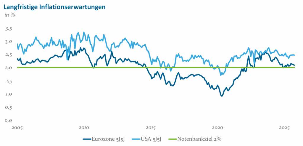 Im Kapitalmarkt gibt es handelbare Instrumente, mit denen Inflationserwartungen gehandelt werden können, d.h. man kann sich gegen einen Inflationsanstieg absichern bzw. von sinkender Inflation partizipieren. Es hat sich als sinnvoll erwiesen, langlaufende Inflationsswaps, i.d.R. 5J Forward in 5 Jahren, zu analysieren, ob sich dort starke Abweichungen von der offiziellen Notenbankpolitik zeigen. Für die Eurozone ist aktuell keine deutliche Abweichung vom Notenbankziel der 2% Inflation auszumachen.