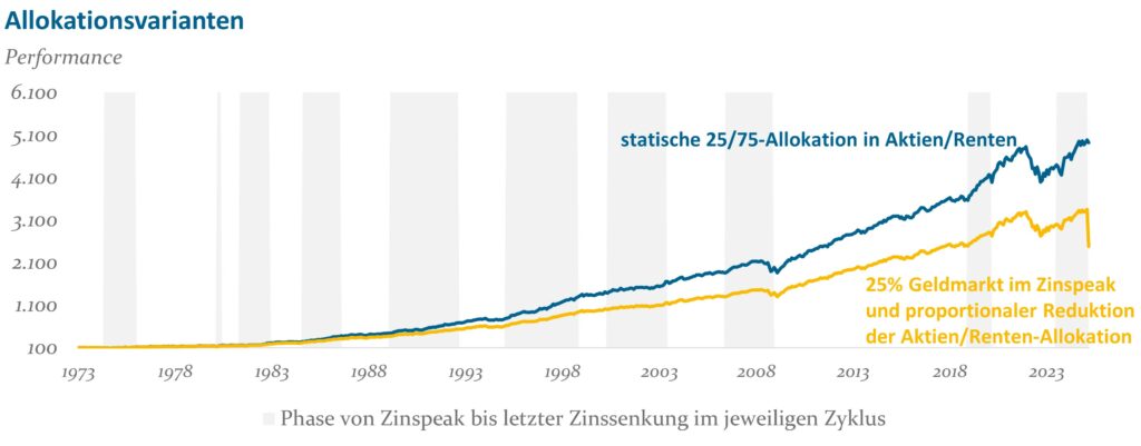 Der Erfolg der Eigenanlage kann nicht nur am Ertrag abgelesen werden. Es stehen auch operative und regulatorische Aufwendungen auf der Kostenseite. Die EZB bot plötzlich wieder eine Alternative ohne Aufwendungen und Kosten. Viele Investoren waren zumindest kurzfristig verlockt, dieses Angebot wahrzunehmen und den Kapitalmarkt temporär zu verlassen. Es gab es viele Diskussionen, ob es generell sinnvoll sein könnte, die hohen Zinsen zu nutzen oder doch lieber am Kapitalmarkt zu bleiben. Obgleich bei einer solchen Frage immer viele individuelle Punkte berücksichtigt werden müssen, zeigen langfristige Analysen, dass eine solche „Timing“-Strategie in der Regel nicht von Erfolg geprägt ist. Um dies unseren Kunden transparent zu machen, haben wir beispielhaft simuliert, wie sich eine statische Aktien-/Rentenallokation gegenüber temporären Allokationen am Geldmarkt historisch entwickelt hätte.2Annahmen: monatliche Rebasierung; alternative Allokation vom Zins-Peak bis zur letzten Zinssenkung des jeweiligen Zinssenkungszyklus, Total Return Indizes basieren auf S&P 500 Index, BBG US Gov/Credit Bond Index, Fed Target Rate Wie die Grafik zeigt, wäre einem solchen Investor sehr viel Rendite entgangen.