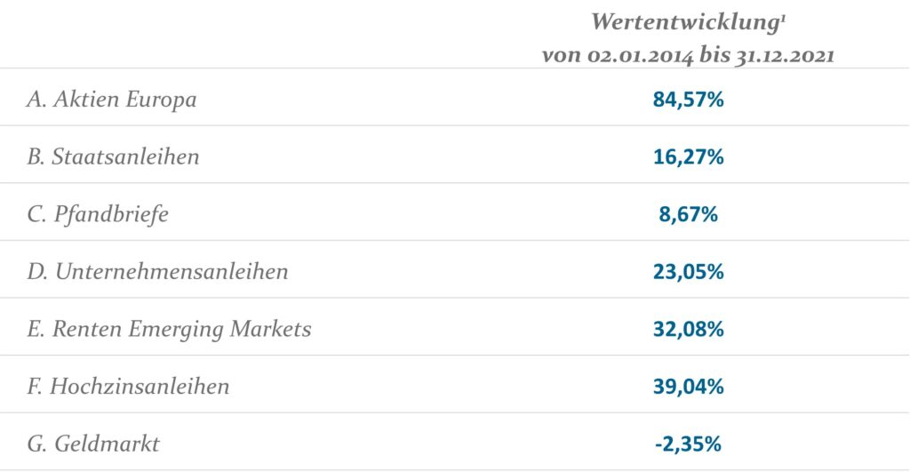 Berechnungen, die auf historischen Daten beruhen, stellen keine verbindliche Zusage oder Gewährleistung für die Zukunft dar. Daher bieten vergangene Wertentwicklungen keine Garantie für zukünftige Ergebnisse. Zukünftige Ergebnisse können sowohl niedriger als auch höher ausfallen. Die Berechnungsmethodik zur Wertentwicklung entspricht der BVI-Methode (netto).